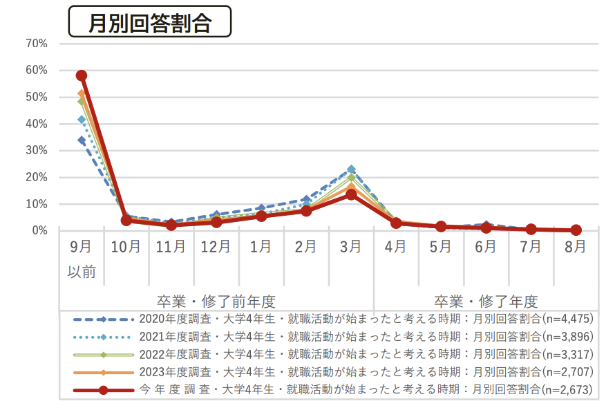 結論:多くの学生は大学3年の夏ごろから就活を始めている